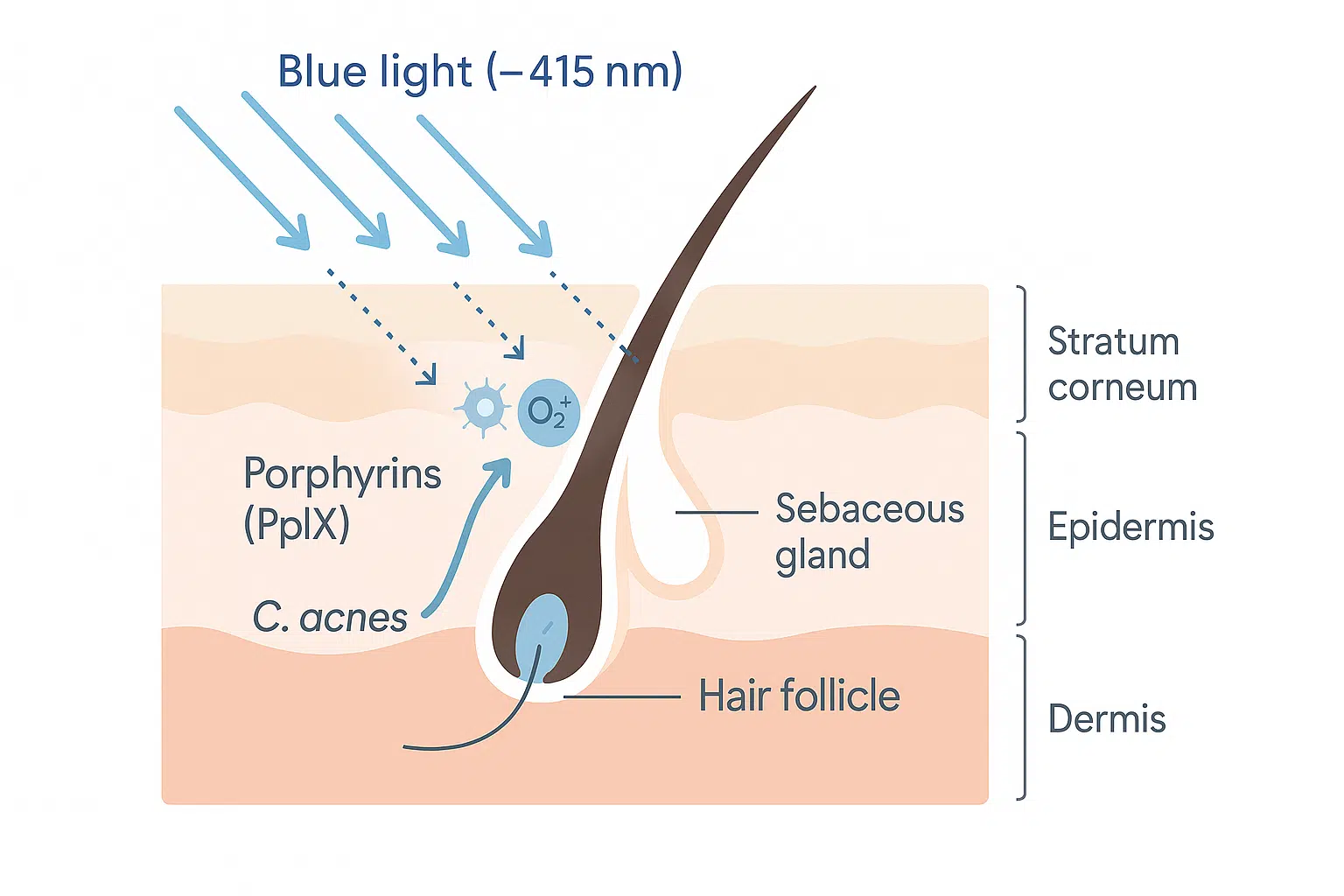 Blue light (~415 nm) excites porphyrins within Cutibacterium acnes, generating reactive oxygen species that damage the bacteria.